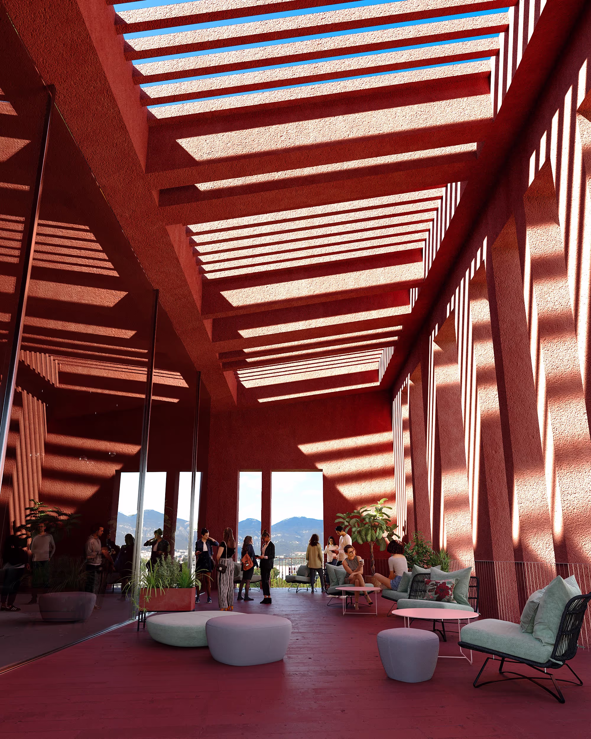 Because Albania is still a relatively poor country, OA worked with the materials and construction processes that were available—concrete, bricks, and mortar—but like local builders, they achieved dynamic results. It’s often said that limited resources, perhaps more so than necessity, is the mother of invention. “We were able to harness efficient, low-tech sustainable solutions common here,” Huesler notes. “Natural cooling through brise-soleils, loggias, and overhangs is an effective low-cost way to keep the heat down in buildings.” These local strategies were introduced throughout the dark red-pigmented structures. “We wanted to make sure that the campus would be something that is both fully reflective of Albania and something it would be proud to present to the European Union,” he concluded.